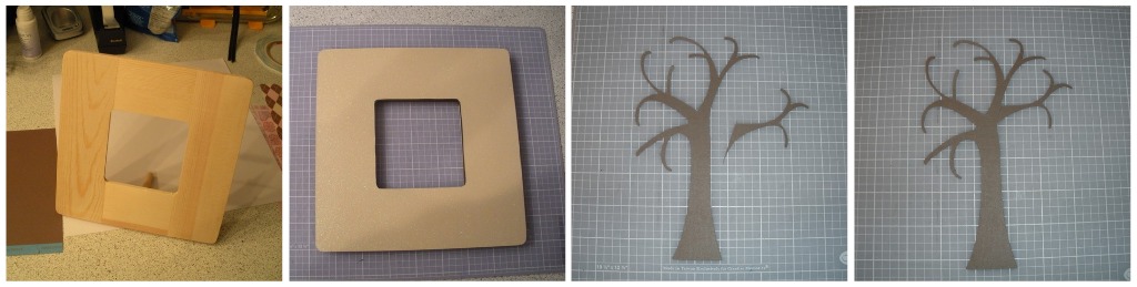 Left to Right: Plain frame, Frame with glitter cardstock attached, tree with trimmed branch, final tree