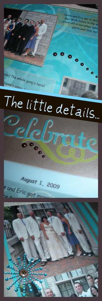 I got to use some cardstock from one of my new favourite stacks All Dressed Up by DCWV, my Tie the Knot and Love Struck Cricut cartridges, some adhesive gems and pearls and of course the photos!