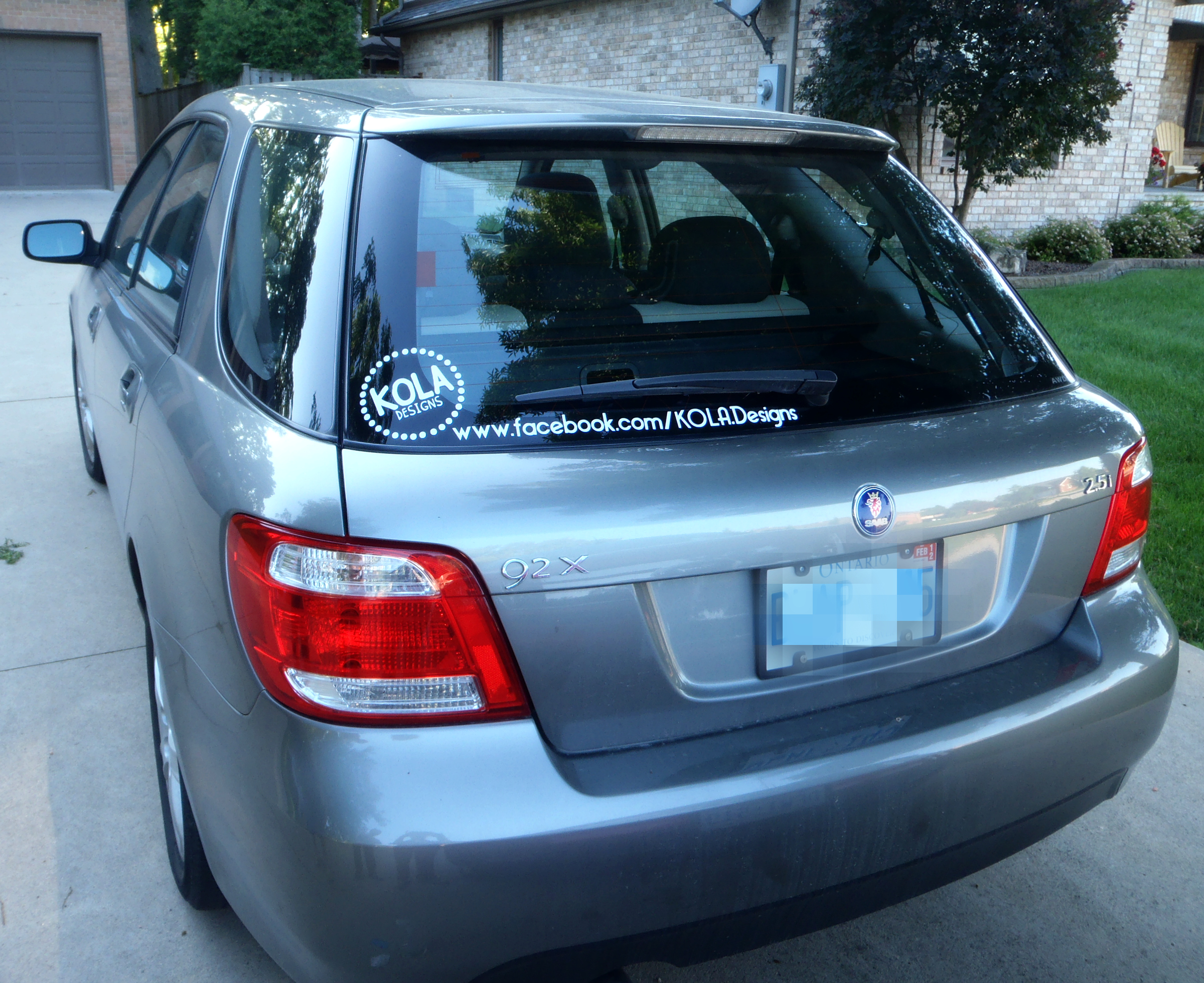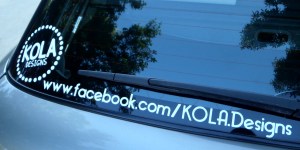 I’ve had my own car for more than a month now and had yet to vinylize it!! I finally decided that I would put KOLA Designs on the back windshield, with the website for the Facebook Page. I’m so happy with how it turned out! I made my logo using cricut cartridges some time ago (I think Accent Essentials and Winnie the Pooh Font) and I’m happy I could put it to more use!!