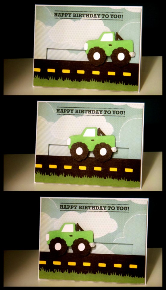 I have seen spinner cards on a few blogs and have been interested in doing one for a while, but I wanted to put another “spin” on it (hehe)! Instead of spinning I wanted to see if I could use the same concept, with two spinners, to make a truck roll across a card. Success! Here’s my finished project, at three intervals of the “slide”: