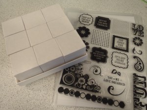 So here’s how the set looks when you receive it (included you’ll find 9 blocks, measuring 2″ x 2″ each, a tray to hold them all, and a HUGE stamp set, the size of 8.5″ x 11″ paper):