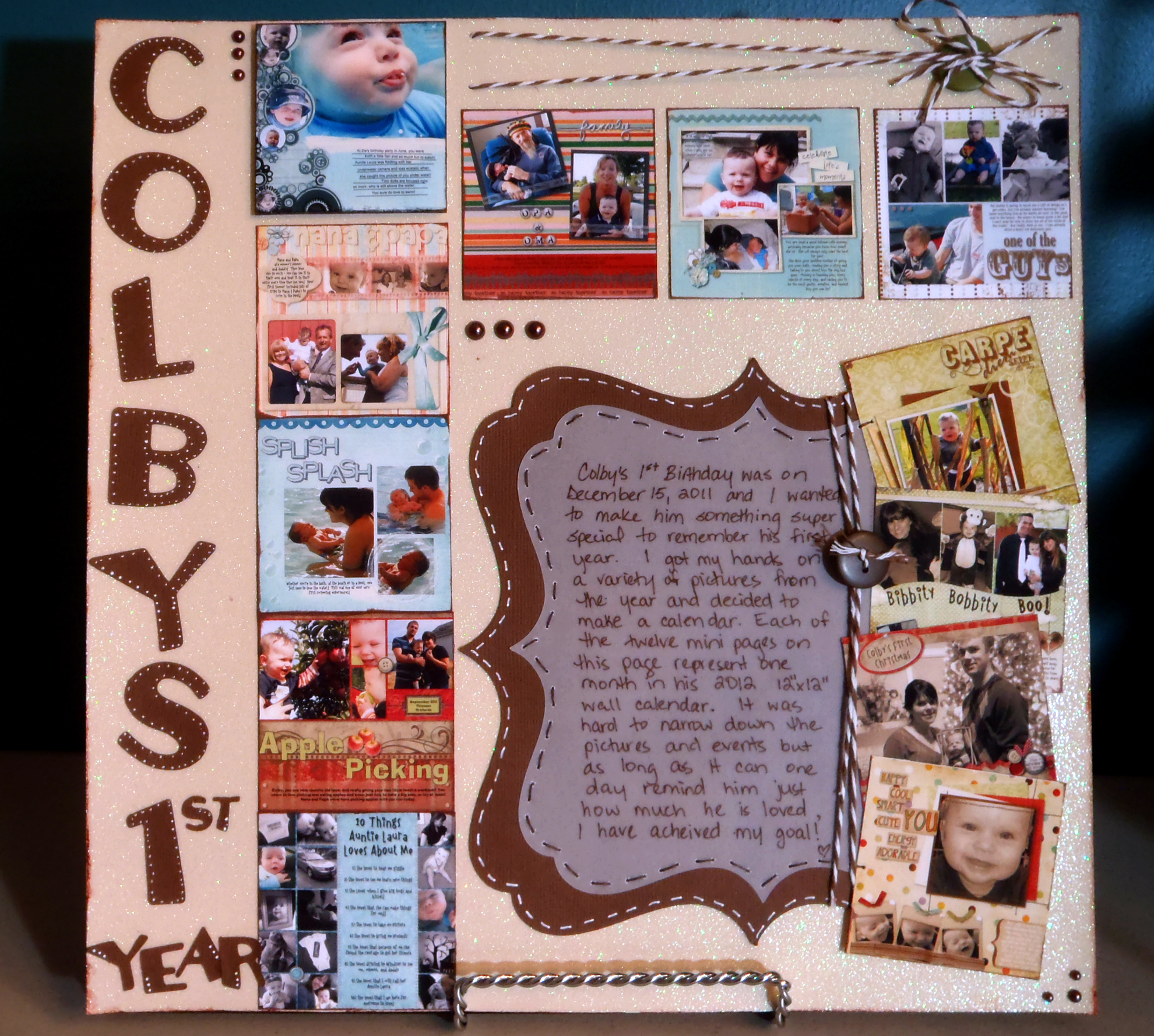 For Colby’s first birthday, I made him a 12″x12″ wall calendar full of memories from his first year. This challenge pushed me to create a layout showcasing all 12 scrapbook pages in one spot – great for me because I didn’t order myself a copy of the calendar 😉