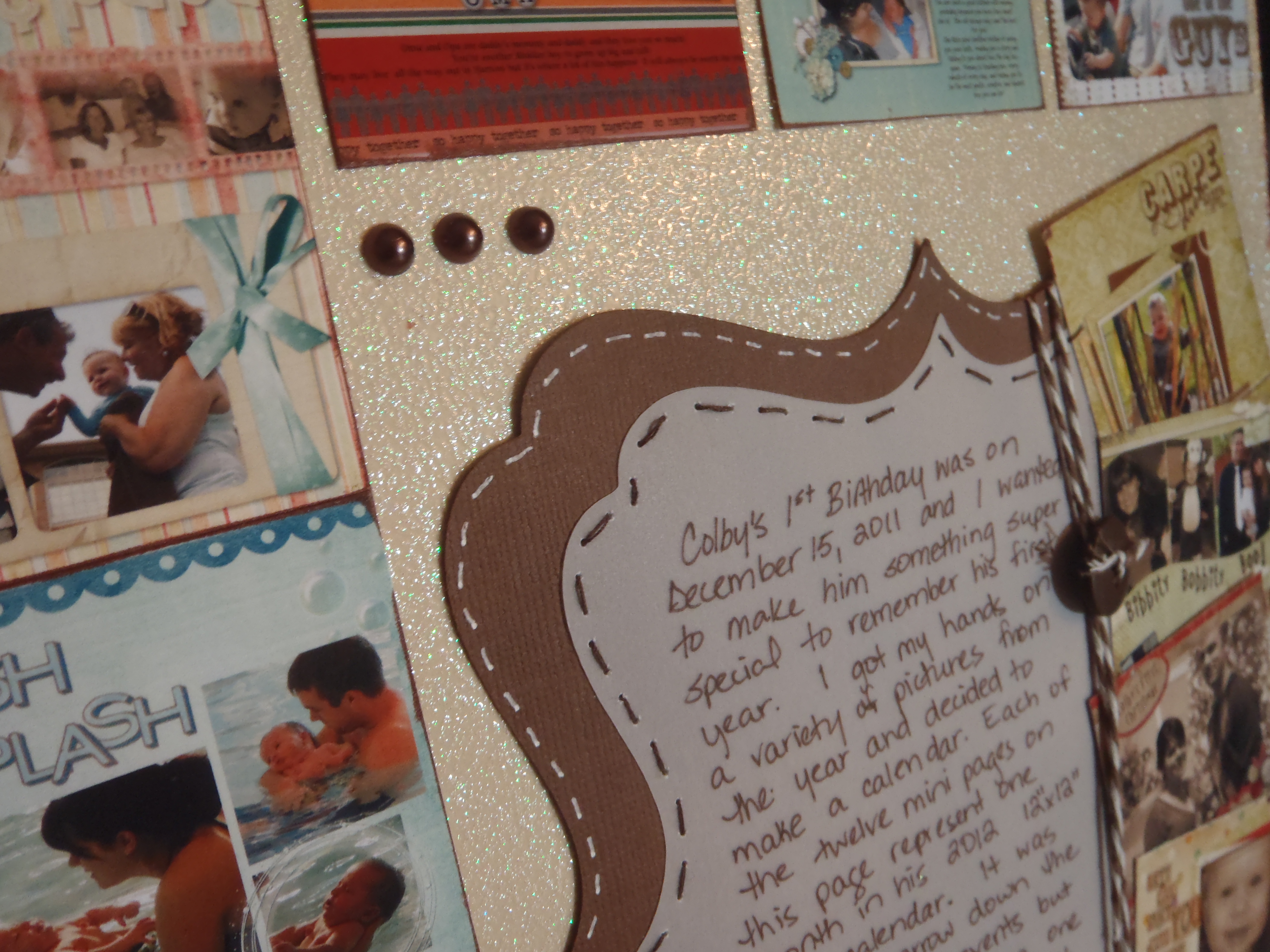 I could have gone a lot of ways with this challenge… This past year has been interesting for me as I have made a lot of changes in my own life and taken on some new adventures. I think I will scrapbook my own “year in review” eventually for myself, but for this challenge I decided to focus on something (someone) who spent the whole of last year seeing everything for the first time! My nephew, Colby, was born at the very end of 2010, and watching him grow and learn each month through 2011 was so exciting!