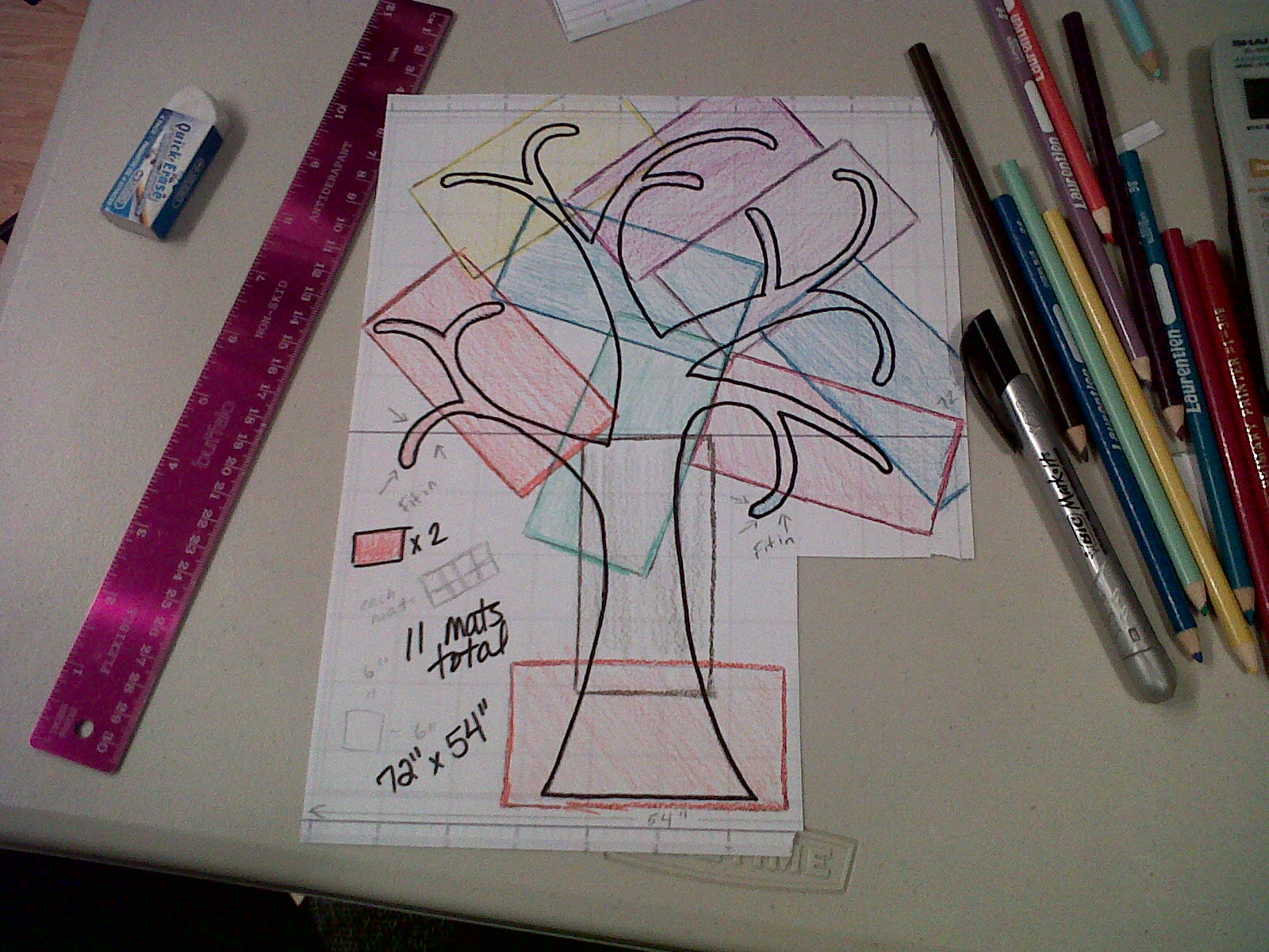 Here is the image I send to most people when they ask for more details on how I mapped out the design. I used colours to keep my 12″ x 24″ “mats” separate visually and calculated everything in inches so that I knew exactly what would fit in each “mat area”