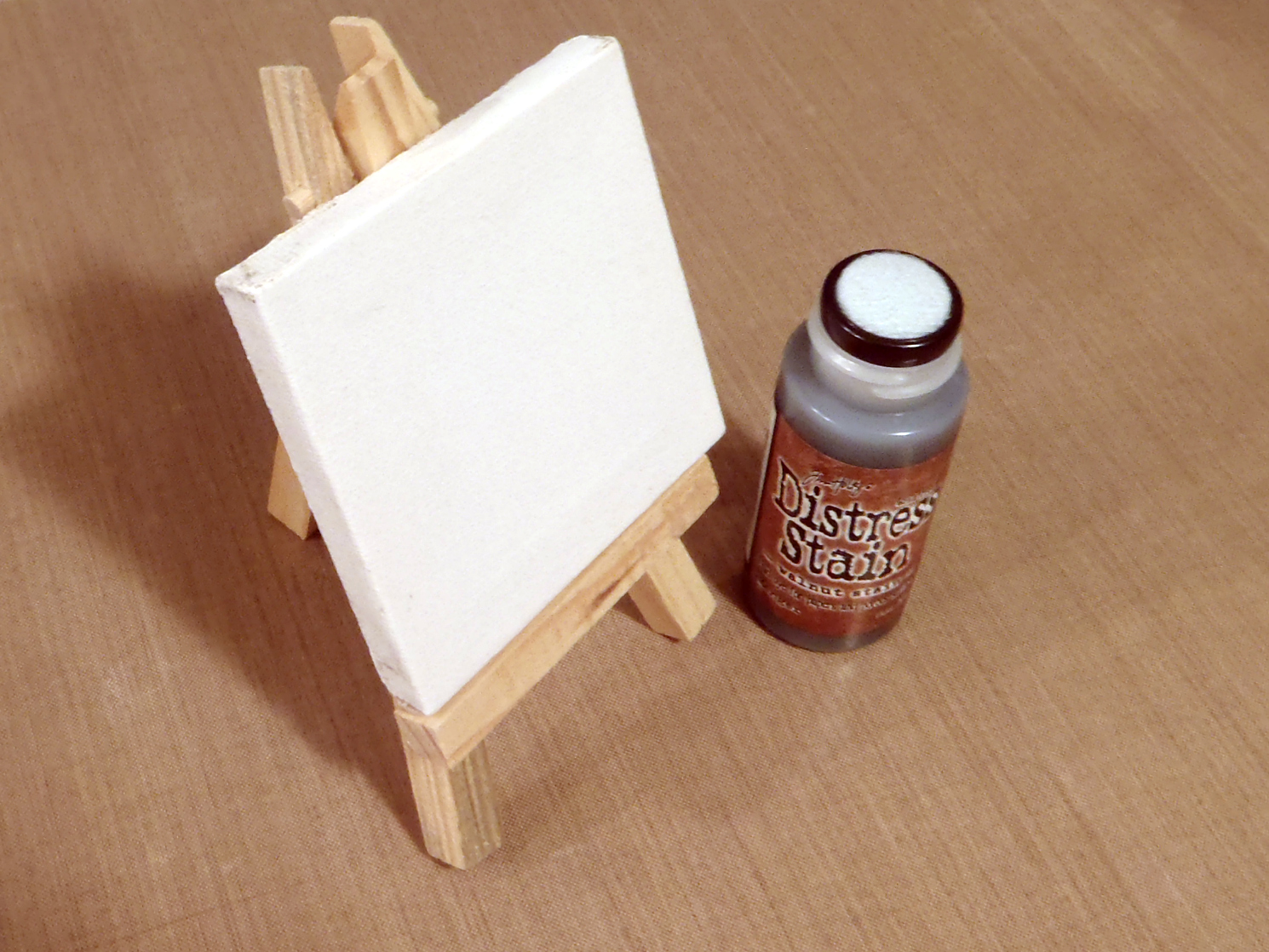 I was feeling stuck on two challenges recently. Not that I couldn’t think of anything, but I could think of TOO MUCH! I had so many ideas that I couldn’t narrow it down. I finally decided to go over to my stash of “ready to alter” items and see what stuck out to me. I had this tiny canvas on it’s easel and since I love all (okay most) things tiny, I thought up a plan! The canvas itself measures just 3″x3″ – it’s adorable all on its own!! I narrowed down my project to creating something for my studio.