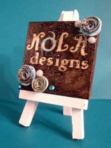 Did you see the distress ink in the photo? I used that to colour the tiny canvas before I started. It dried pretty quick and by the time I finished cutting everything, it was ready to work with. I used Letter Envy (as required!) for the “K,L,” and “A” and Cricut Everyday for the circle logo to act as the “O” (for the second challenge). Art Philosophy was used to cut the flowers and the word “designs.”