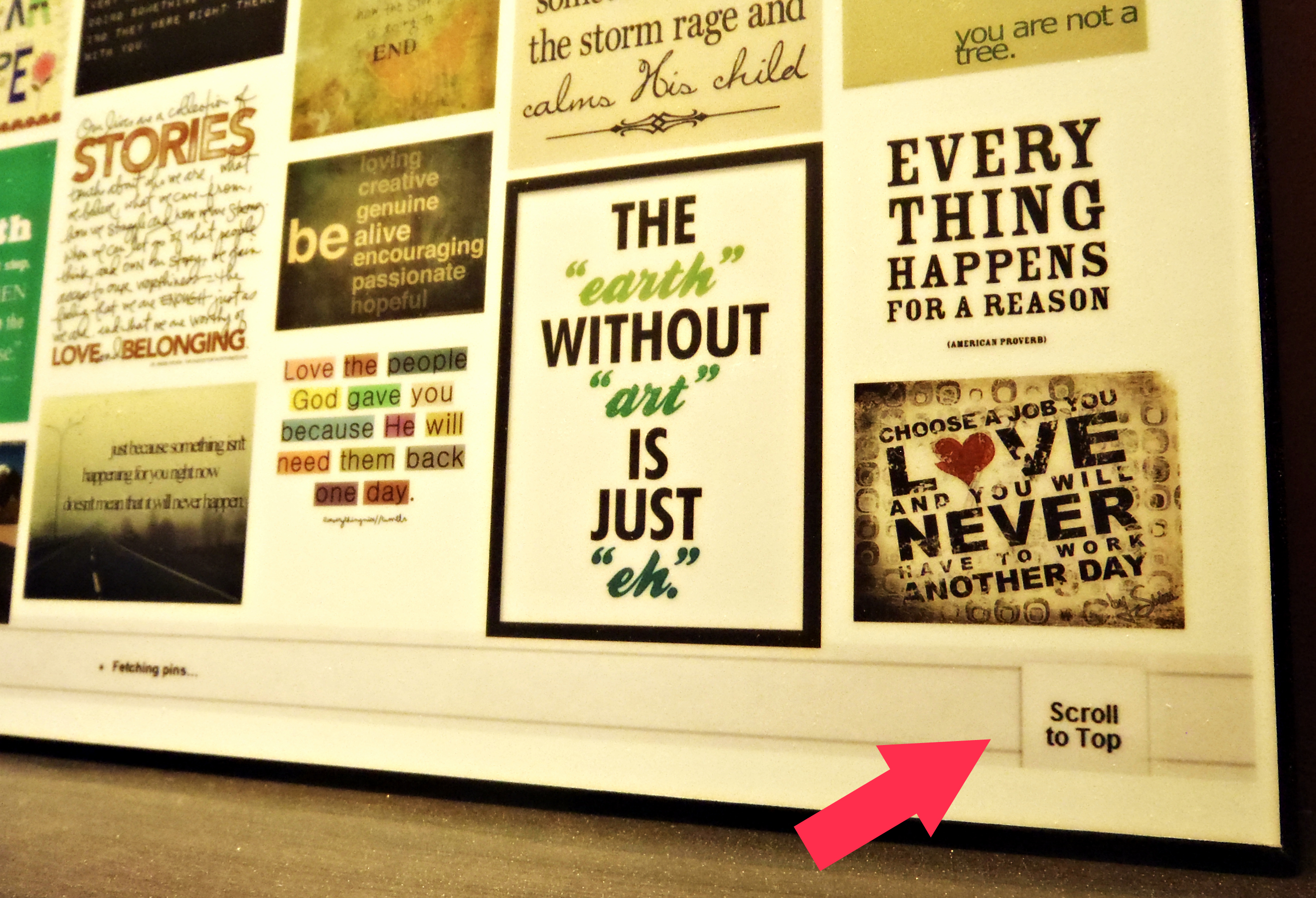 I started with a blank document, sized 20″ wide by 32″ tall.  I wanted to replicate the idea of an actual page on Pinterest so I created columns to mimic the website.  The pictures were all resized to either 2″ or 2.5″ wide and their height was kept in proportion with the width.  To really get the “Pinterest” feel, I took screen shots of the “fetching” animation as well as the “scroll to top” button to incorporate into my poster.  I ended up using 87 pins from the Inspiration Board (you can find my original board here).  I can’t take credit for any of the individual quotes or images since they were all pins from others artists o n Pinterest, but the poster idea and format is all my own.   I have so many new pins in on the board that I may have to do another version of this soon… Pinspiration 2, anyone???