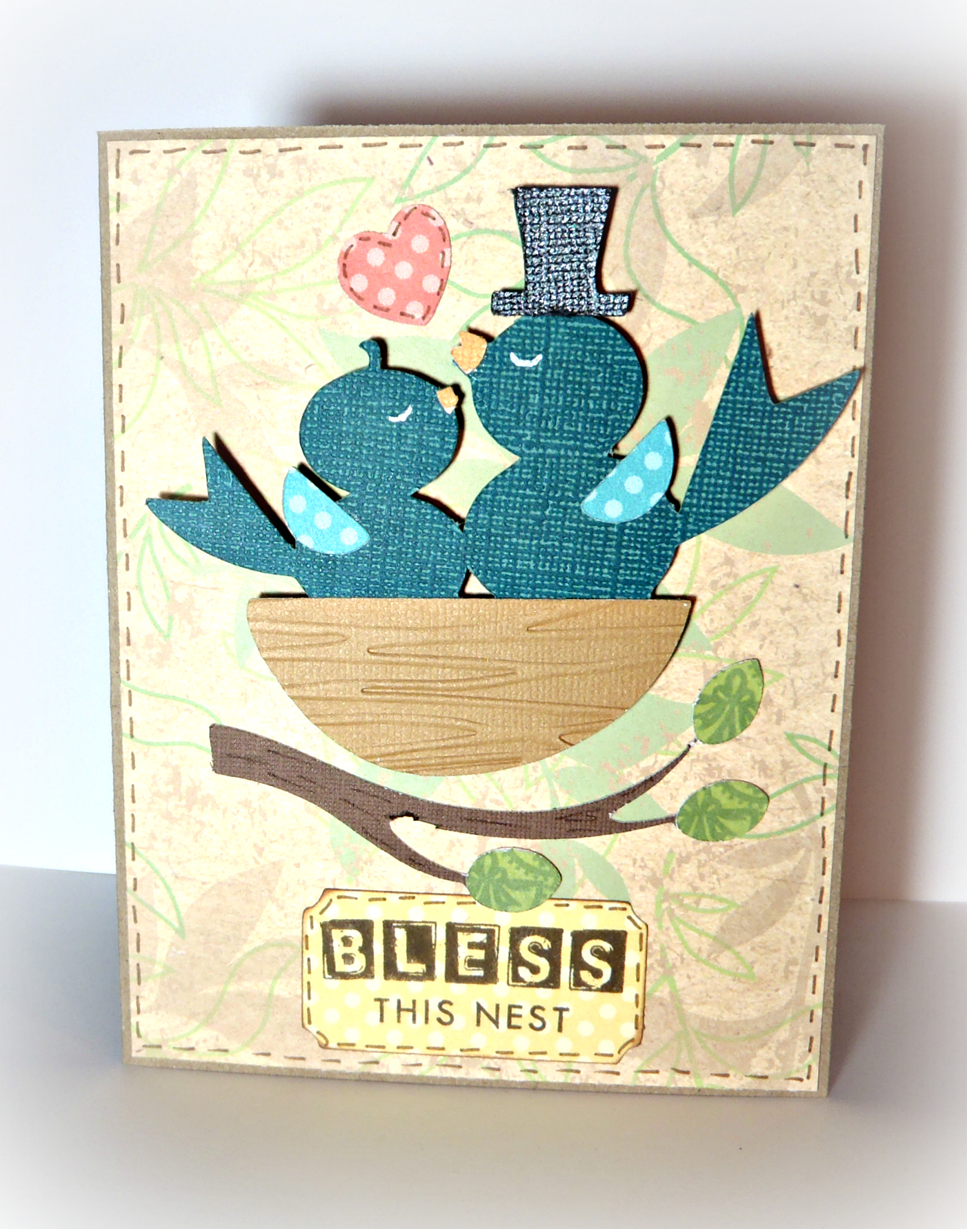The birds in their nest are from the Sweethearts cartridge and the ticket shape is from Art Philosophy. I used my new Distress Markers to add my stitching!