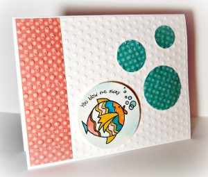 I wanted to use some of the images I had stamped earlier in the week to experiment with my new Distress Markers (I am so in love with them!! lol – they were a birthday present from my siblings for my birthday in February and finally arrived after being on back order for what seemed like an eternity!)   The stamp is from Under the Sea – such cute sayings and images on this set!  I used Liquid Glass to make the bubbles three dimensional and sprinkled on some glitter while it was still wet to add some sparkle.