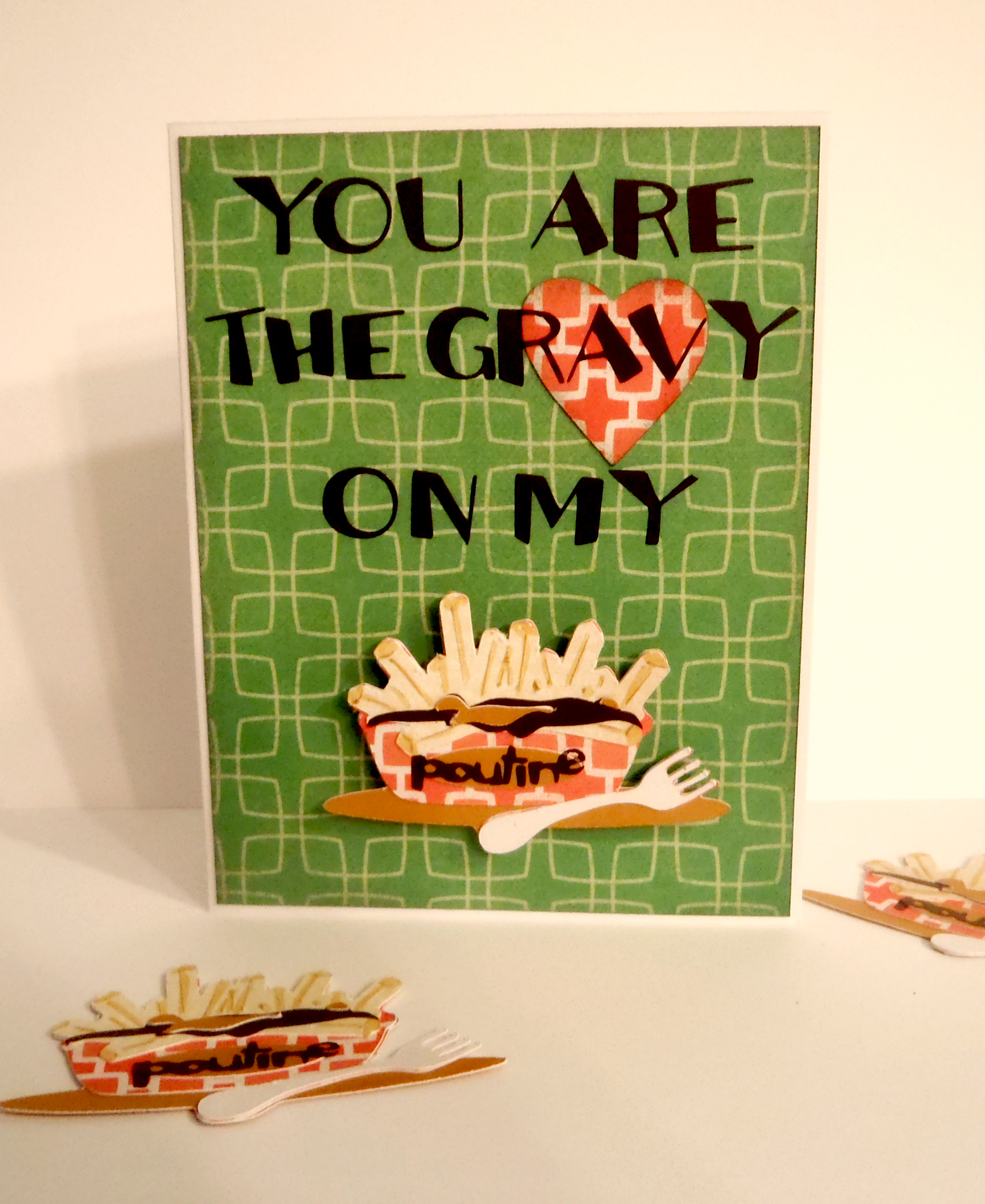 Last but not least, a humourous card that can be used for anything!  Birthday, Anniversary, Mother’s Day, Just Because, and more!!  I used the Go Canada cartridge for the poutine and font, and Art Philosophy for the heart – mmmm… poutine!