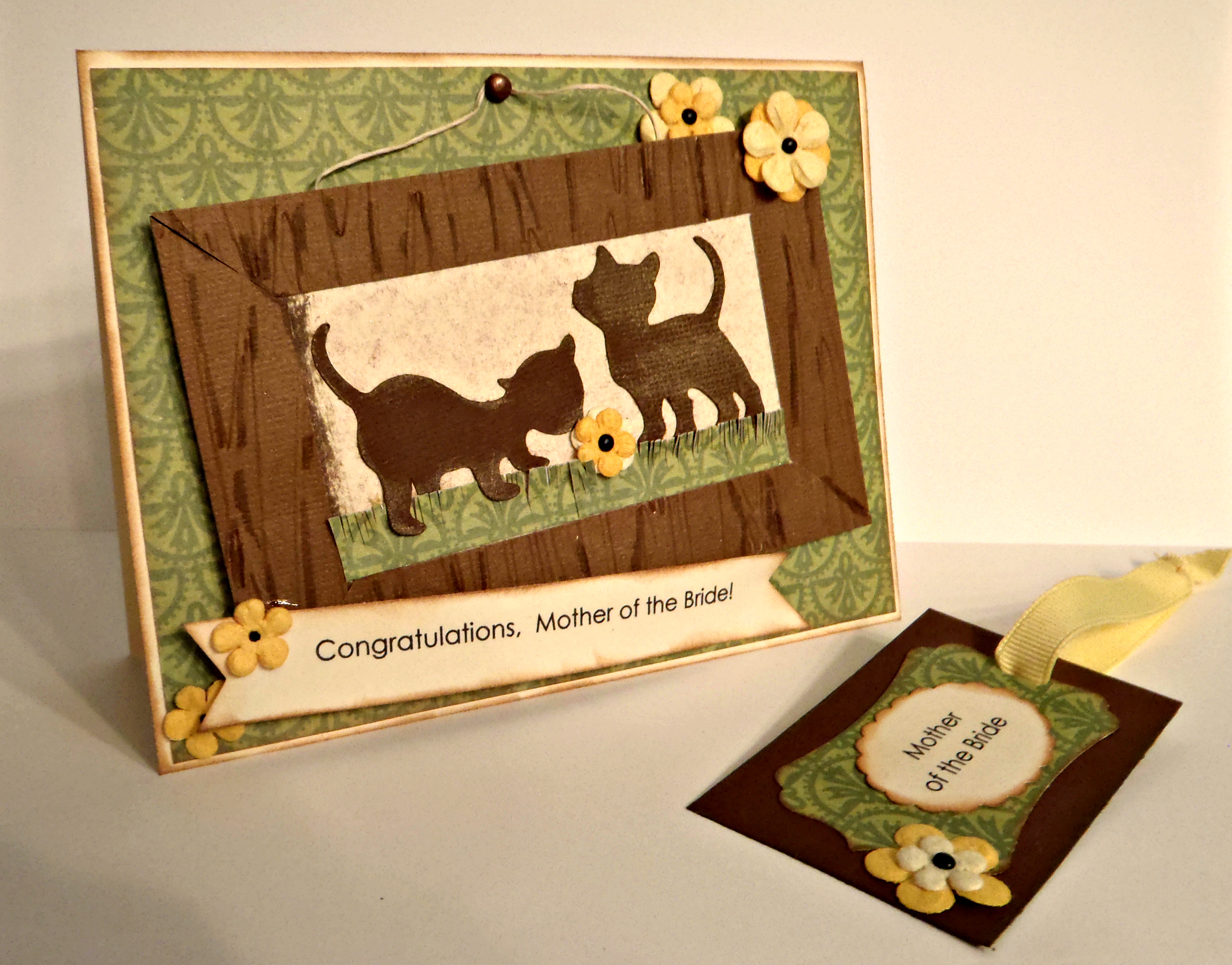 On the card, I used cats from Kate’s ABC’s, some Recollections paper flowers, and a hand cut frame and grass. The frame was embossed with the Cuttlebug and everything was inked in different tones. A pewter brad made a great nail/pin for the picture to “hang” from. The tag (to go on a gift) was made using various punches I had on hand – you could use many different cartridges for similar shapes!