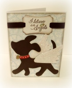 I used a dog from Nate’s ABCs and wings from Gypsy Wanderings for the dog angel card, and the cat from Zooballoo along with butterfly wings from the Art Philosophy cartridge for the cat angel card. The wings are glittered using liquid glass adhesive and coarse glitter. Use the tip of the glue to spread it all over the wings. Once you have an even layer, pour the glitter over top while it is still wet. Tap off the excess, and leave to dry – it will take a while to dry completely, but this glue dries super clear and all you’ll notice is the glitter 🙂