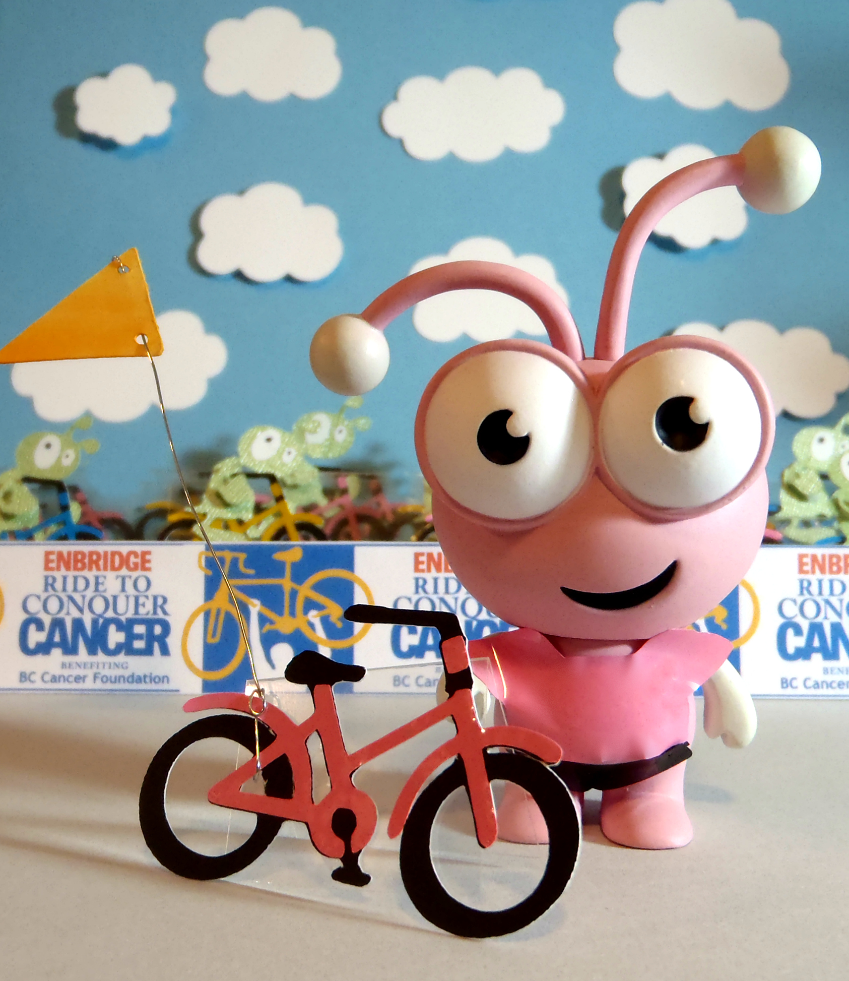This month’s challenge for the Circle Magazine is to “dress up” one or more of the little Circut Vinyl Collectibles. I only own one of these, and it is the pink one, modeled after the breast cancer limited edition Cricut Machine. I always think of my amazing sister in law when I look at that little guy and decided to pay tribute to both her and my brother through this challenge! Over the past weekend, they took part in the Ride to Conquer Cancer, riding for a total of 200 kilometers in just two days!!! The entire event broke records and raised over 18 MILLION dollars for cancer research!! Over $7,000 of that was from my brother and sister in law.