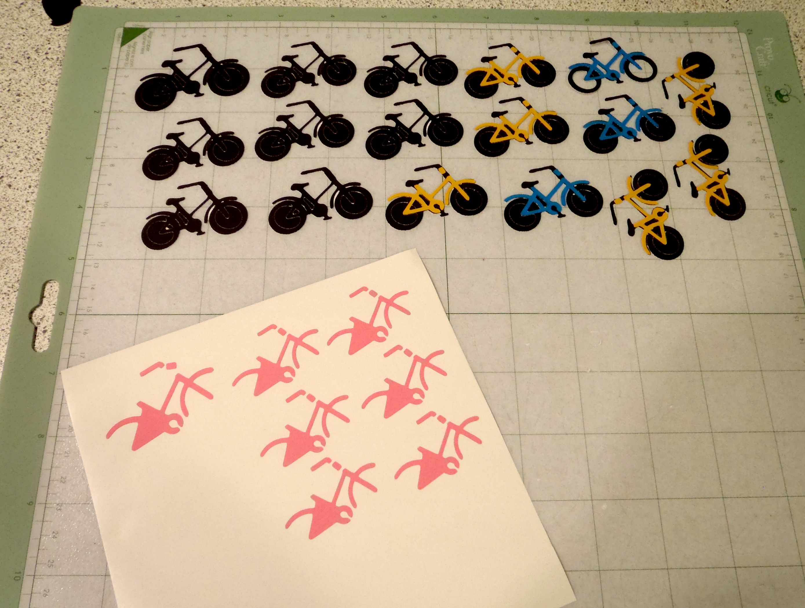 Here’s a picture to explain how I left the bike bases on my mat to layer them since they were so small and I would have been chasing them all over the craft room! lol You can also see the size of the cuts here, in comparison to the cutting mat 🙂