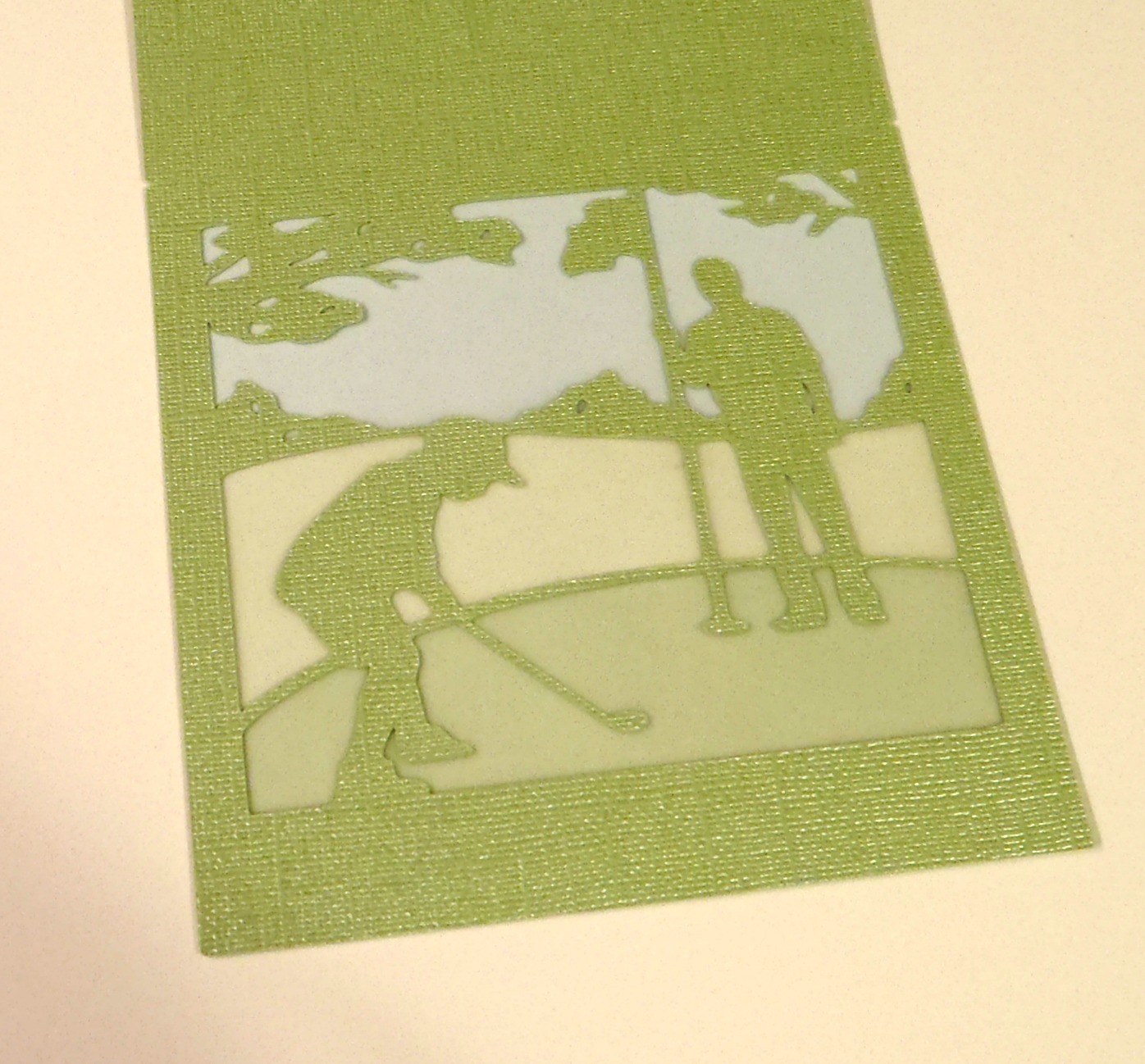 While the card looks beautiful on it’s own, with a blank background, I wanted to spice it up with some coloured vellum. I used green and blue and hand-cut shapes to fill in each space. I used green in a small space (on the putting green) and then over the whole grass section again so that the putting area seemed like a darker shade than the rest. I hope the pictures help to explain more 🙂 …