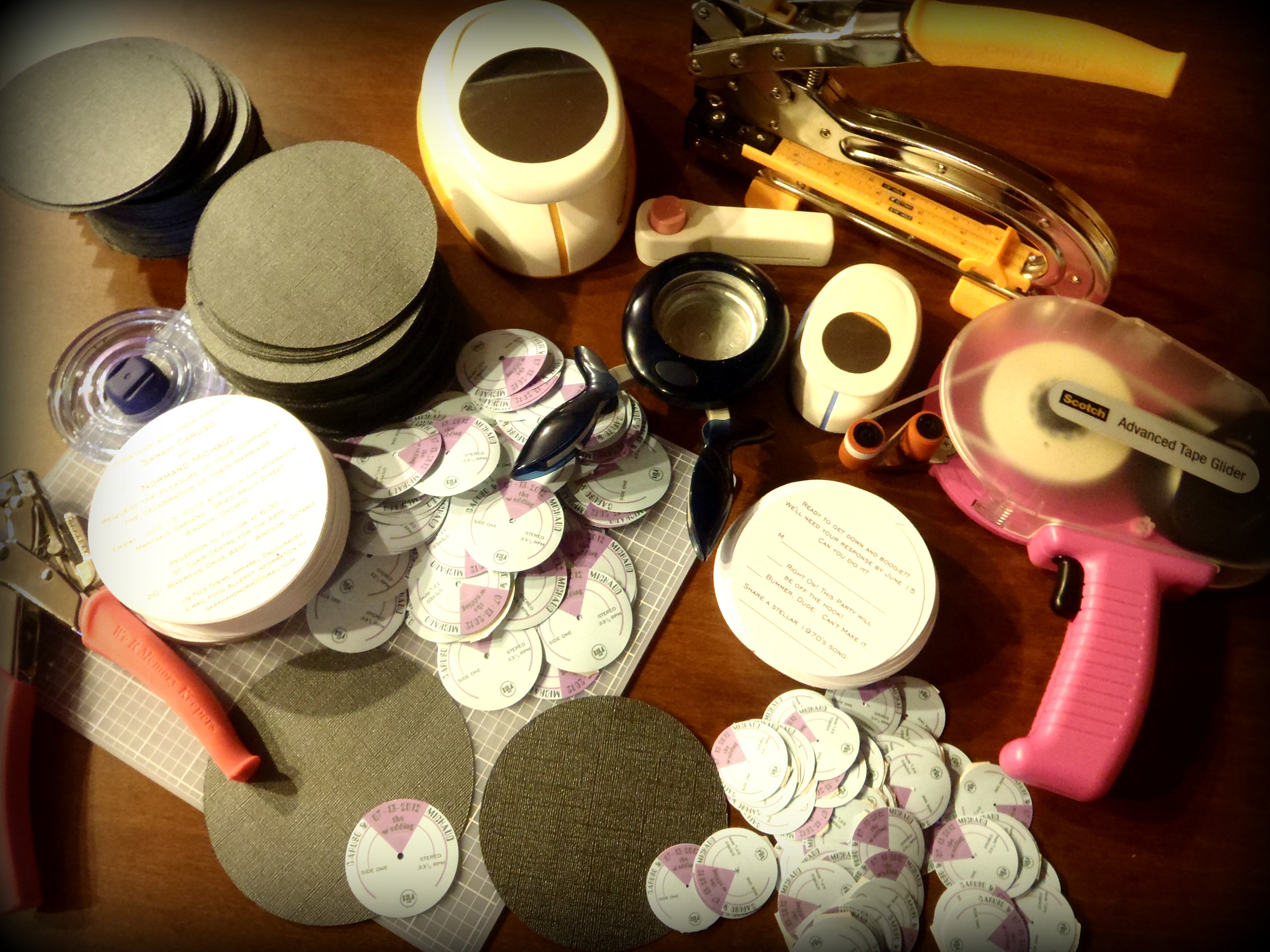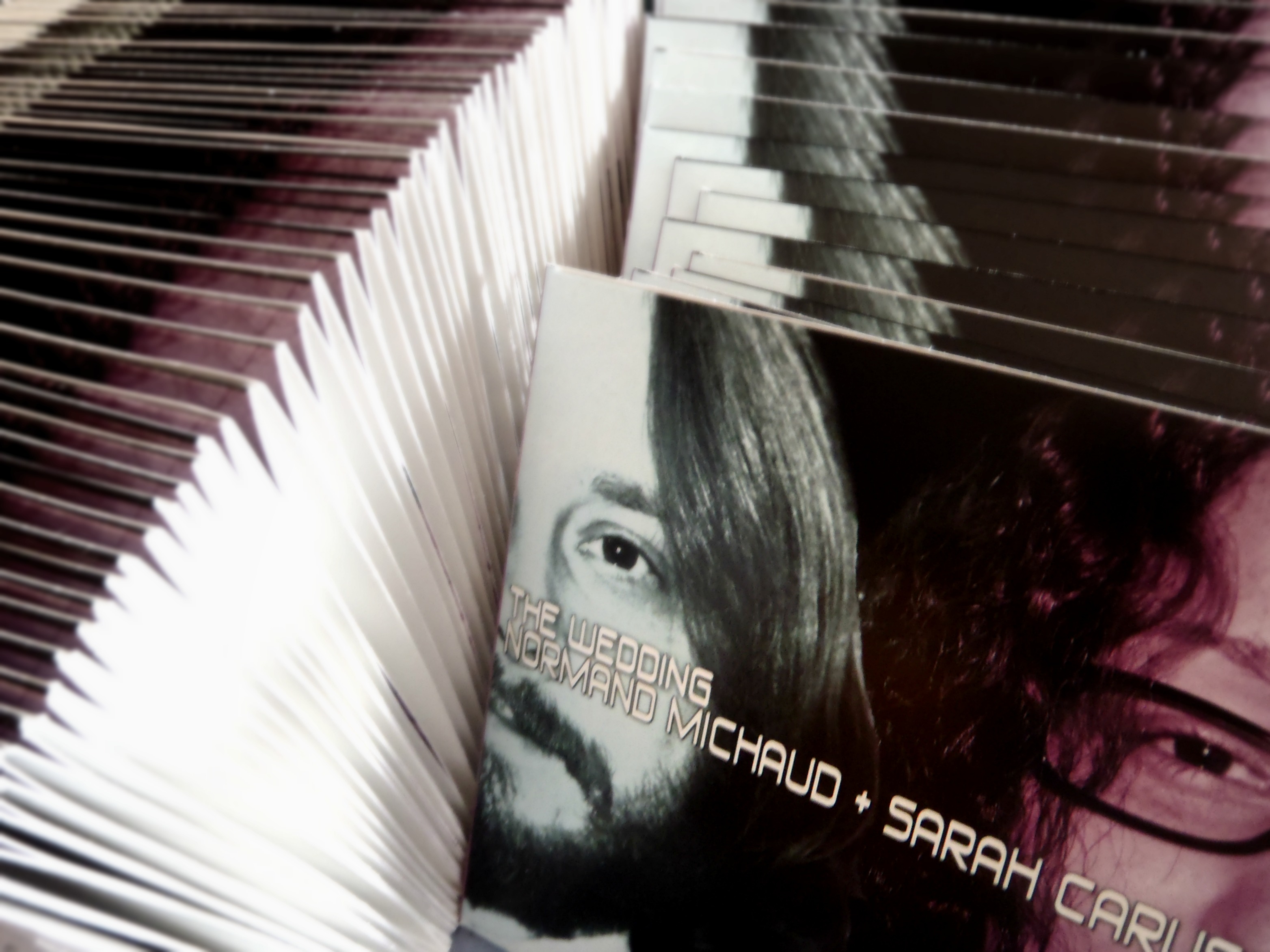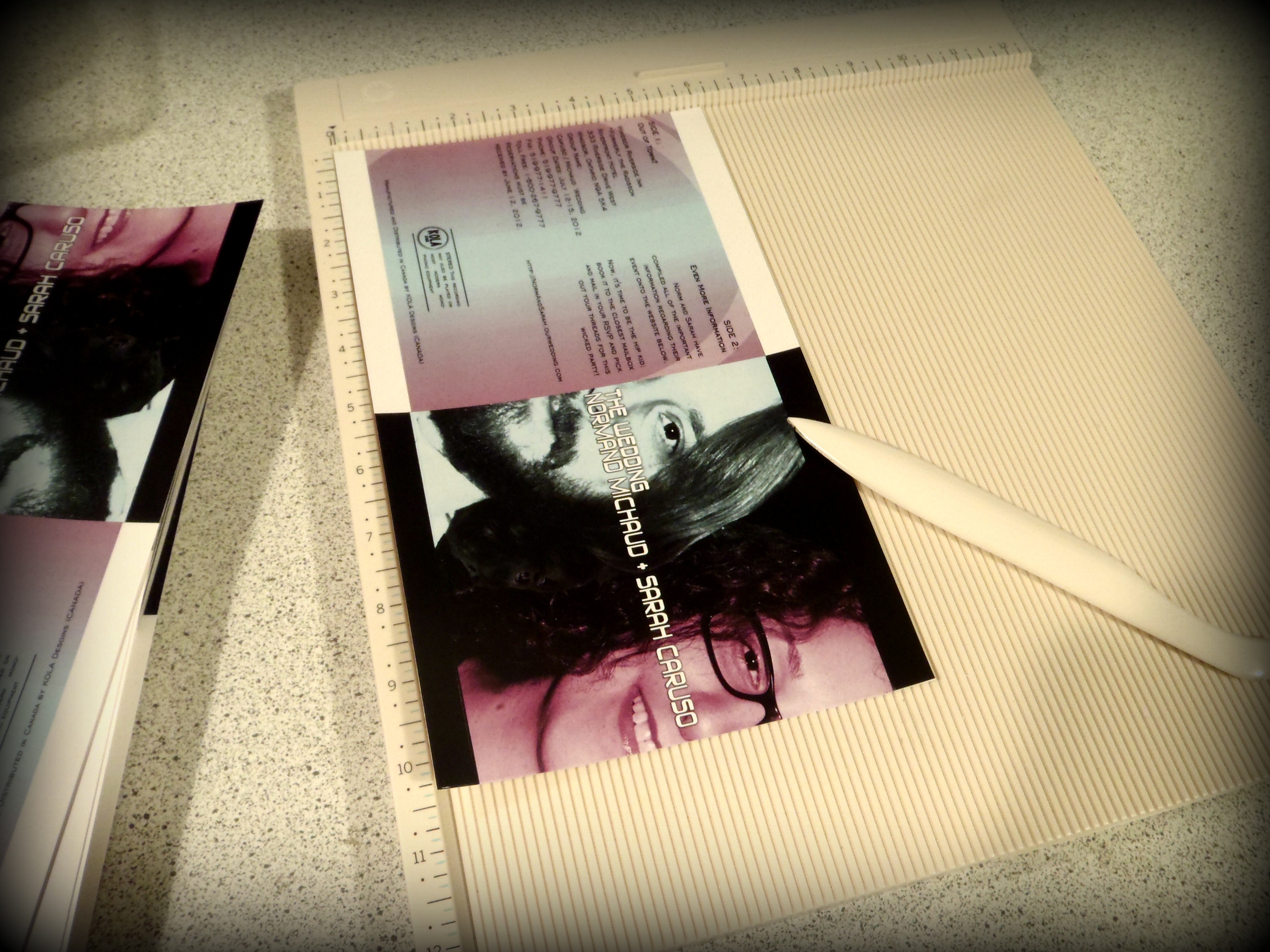 With a photo of each of them, I used Photoshop Elements to create their own cover art for the record; once I had created a full cover template (complete with extra info on the back for out of town guests), I had them printed on 8.5″ x 11″ glossy card stock. These covers were each cut, scored, and assembled by hand.