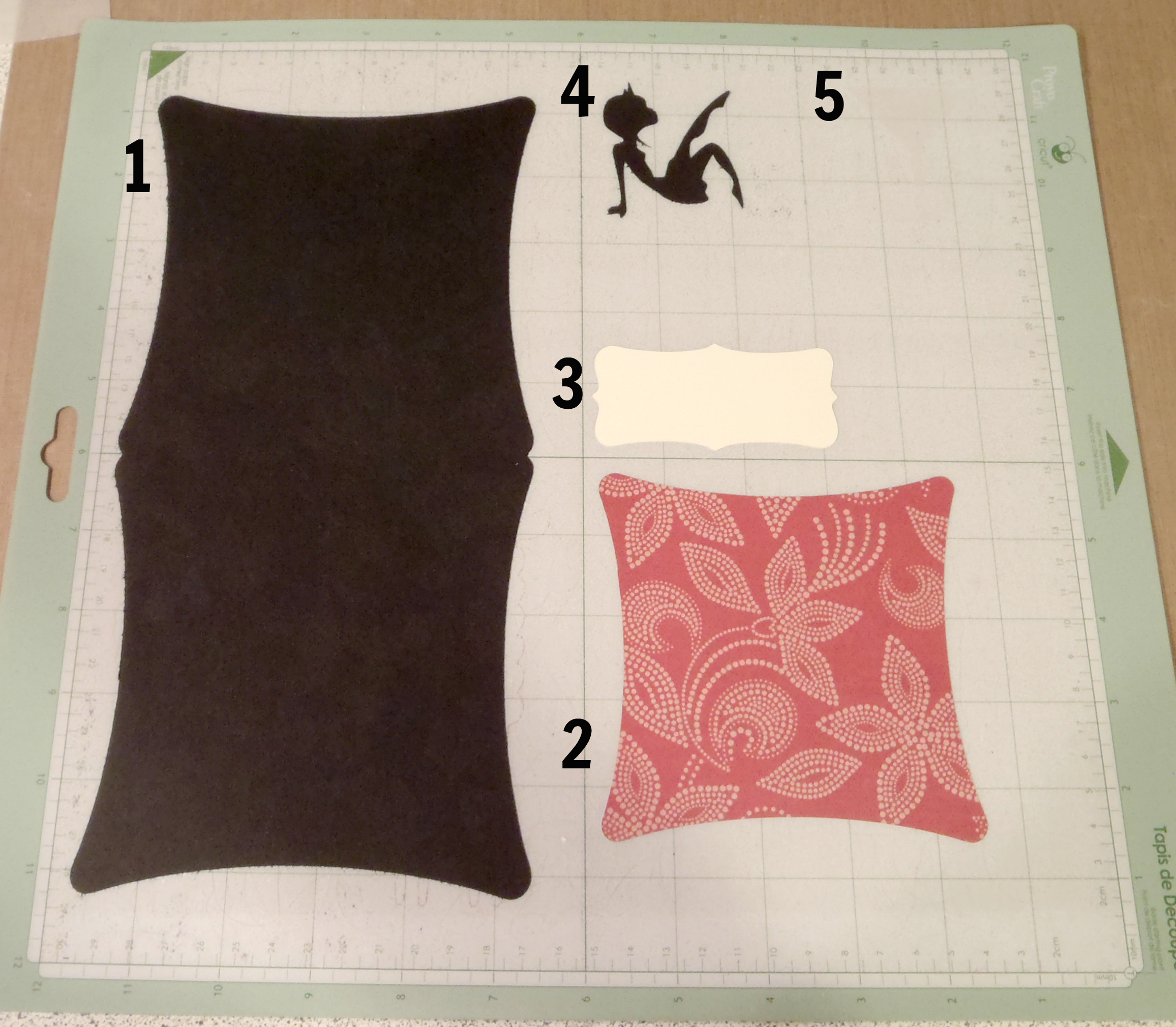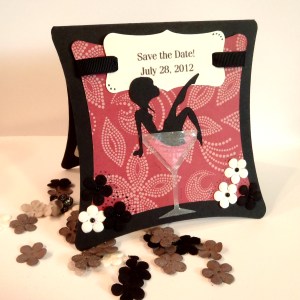 For my card, I chose to create a Save the Date card that was actually used to let the bride know when her bachelorette party was going to be! The party just happens to be tomorrow! I used the card base from page 34 in the Art Philosophy handbook. I love using my Gyspy to lay out all of my images before I cut – here’s a look at the pieces I used and how they look on my mat after cutting: