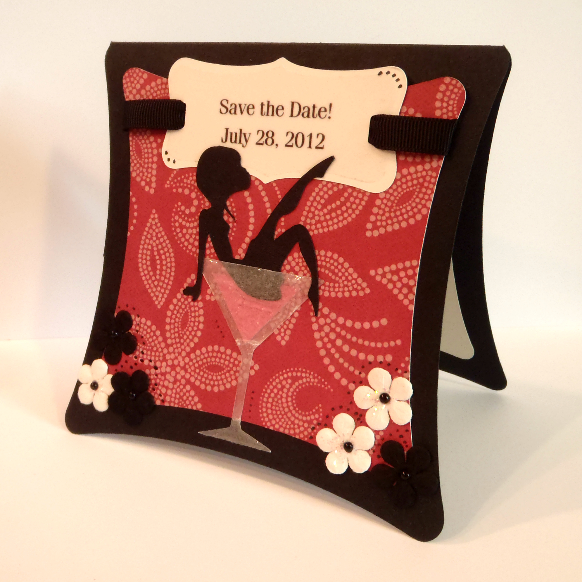Next, it was just a matter of scoring my card, folding it in half, and adding my layers and embellishments! A handful of flowers, some bling, and a little doodling finished it all off! Time to party!!