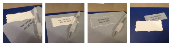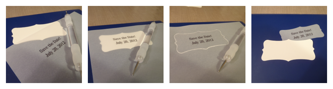 My next step was to create the type for my tag; to do this, I printed what I wanted it to say onto vellum from the computer, and then used the tag I had cut as a template to trace around my words with an embossing stylus, and then cut inside the line to create a matching shape to layer.