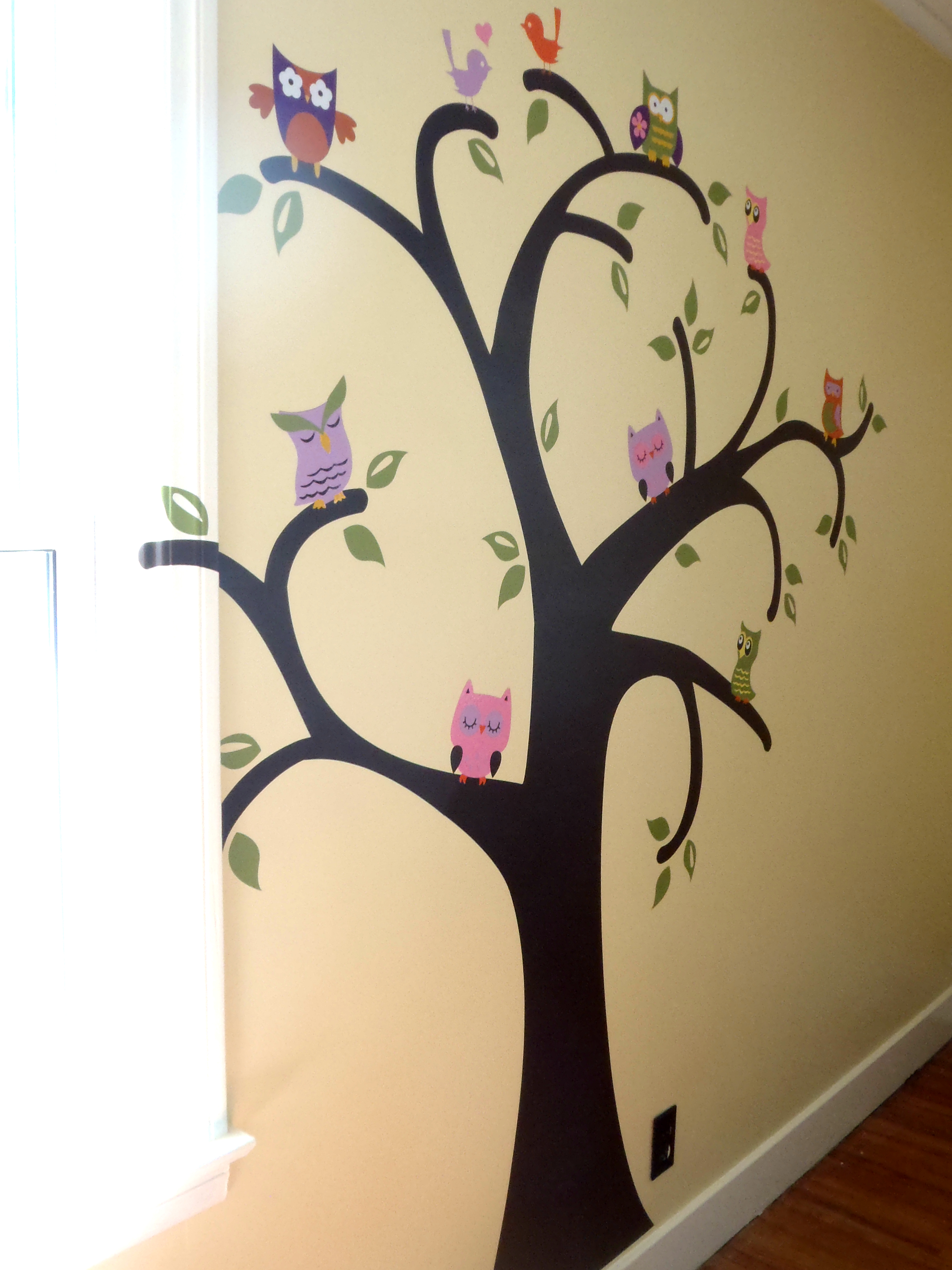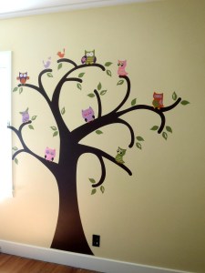 Have you noticed that owls are quite the trend lately??  I see them in scrapbook papers, bedding, clothing, accessories and more!!  I was delighted to put a vinyl tree up in a baby room yesterday and loved the overall owl theme!  She’s expected to arrive in a couple weeks and has so many owl stuffed animals and decorations in an abundance of colours, ready to welcome her.  The tree and the 8 owls that live there, is a perfect addition to bring the room all together!
