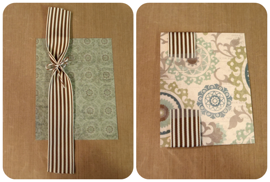 I tied a small piece of twine in a bow around my new striped chocolate ribbon and used it as an embellishment on my card. I found that if I’m working with twine, it’s easier to tie it on before it’s adhered to the project so that I can fiddle with it and twist it until I have it just right ;). I use clear tape to adhere each end of the ribbon to the back of the paper, making it look like it’s tied all the way around when it’s really not – here’s a look at that for anyone unclear of that “technique.”