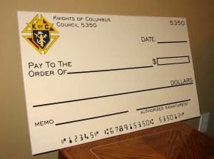 I used my computer to create the cut files I needed to cut out the logo for the Knights of Columbus (the organization that spearheaded the event, and in turn was making the donation to the camp from the funds raised).  In addition to cutting out the logo, I cut out all of the cheque details in black vinyl, using a real cheque as reference so I didn’t miss anything important.